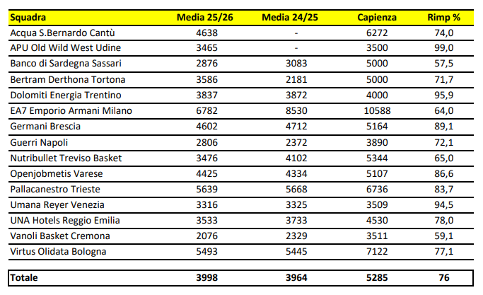 La vera sorpresa della stagione è rappresentata dalla Bertram Derthona Tortona, che grazie alla nuova Nova Arena ha registrato un’impennata del 64,4% nell’affluenza rispetto alla scorsa stagione disputata a Casale Monferrato. La media è passata da 2.181 a 3.581 spettatori, un salto che il presidente LBA Maurizio Gherardini ha definito “un segnale importante legato a un’impiantistica che ha visto finalmente esordire una nuova struttura“.