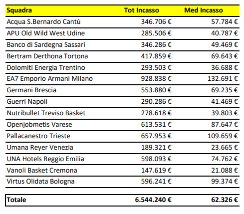 Gli incassi complessivi generati dal girone d’andata ammontano a 6.544.240 euro, con una media per gara di 62.326 euro, in crescita rispetto ai 58.761 euro della stagione precedente. Oltre a Milano, superano ampiamente la media del campionato Trieste (109.659 euro), Bologna (99.374 euro), Varese (87.647 euro), Reggio Emilia (74.762 euro), Tortona (69.643 euro) e Brescia (69.235 euro).