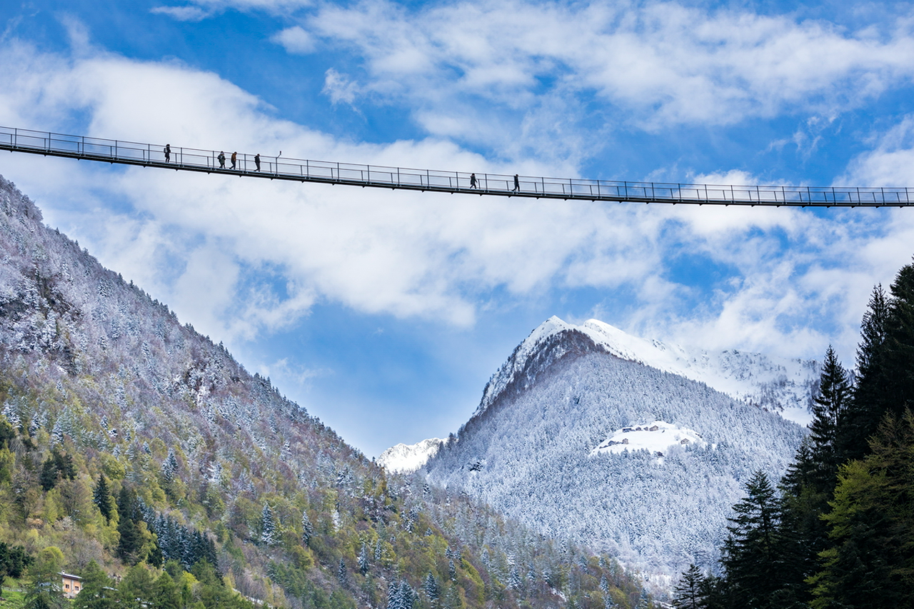 La dimensione naturalistica emerge invece con forza in Val Tartano, dove il Ponte nel Cielo – uno dei ponti tibetani più alti d’Europa – permette di attraversare la valle sospesi nel vuoto, regalando una vista spettacolare sulla Bassa Valtellina e, nelle giornate limpide, fino al lago di Como.