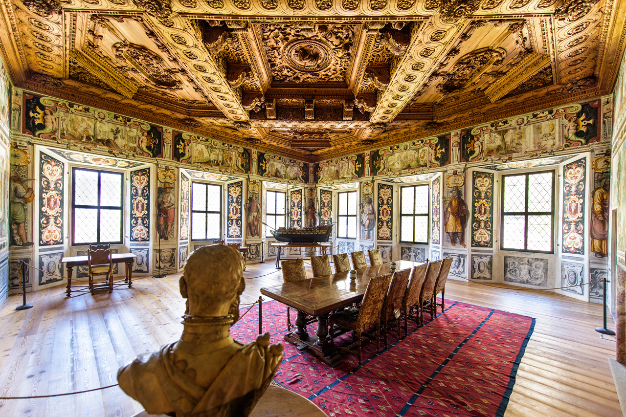 Il palazzo è l’unico edificio sopravvissuto alla frana che nel 1618 distrusse l’antico borgo, e conserva ancora oggi ambienti decorati con evocativi affreschi mitologici ispirati alle Metamorfosi di Ovidio, soffitti intarsiati e stüe in legno.
